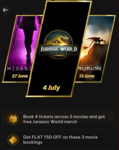 5. After booking 4 tickets you will able to claim Free Jurassic World Merchandise. Also, FLAT ₹50 Off on these Movie Tickets.